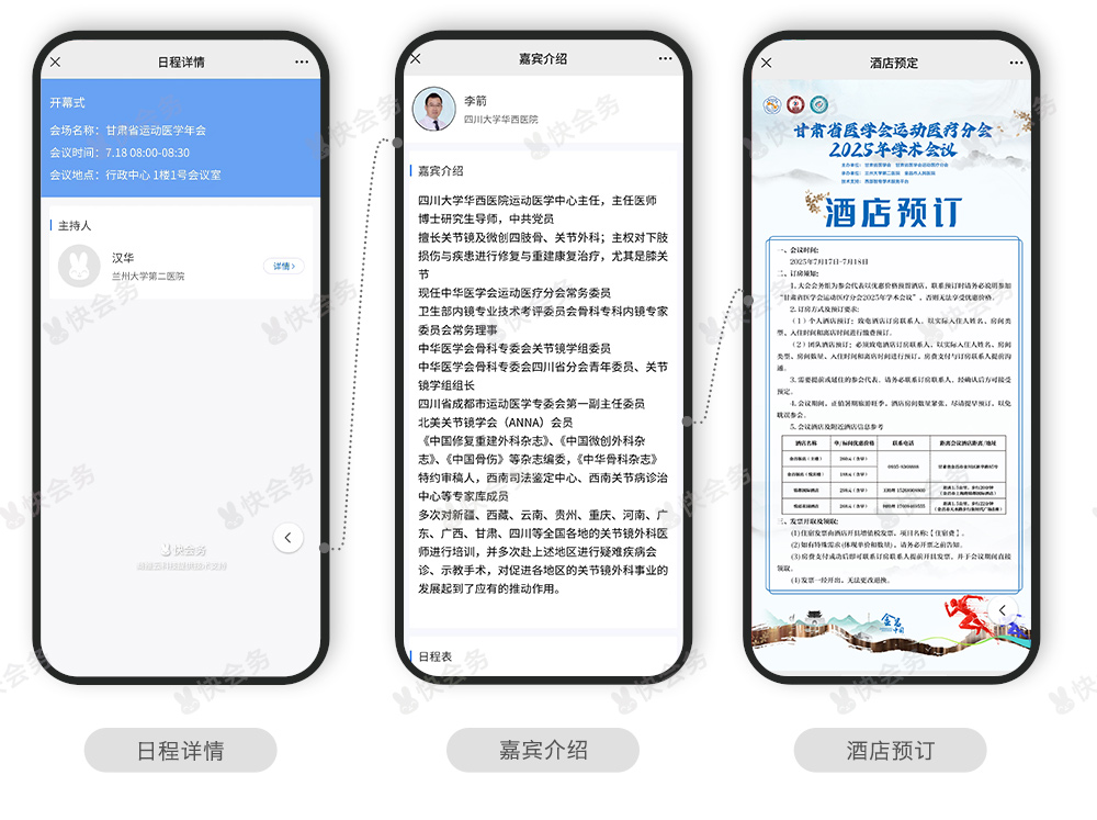 2025年7月17-18日,由甘肃省医学会、甘肃省医学会运动医疗分会主办的“甘肃省医学会运动医疗分会2025年学术会议”在甘肃省·金昌市举办。快会务智能会议管理系统为本次大会主办方提供了智能会务手册搭建服务支持。快会务一站式数字化会议管理系统,它的高效率从活动发布、注册报名开始,会前注册报名、线上审核,到会中签到、酒店住宿、就餐安排,再到会后数据管理每一个环节都能体现。