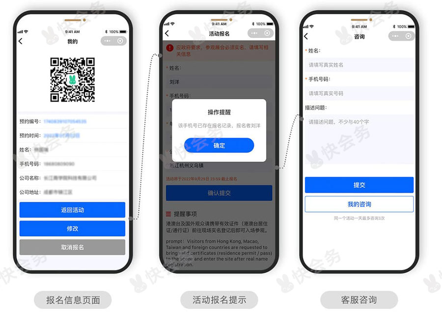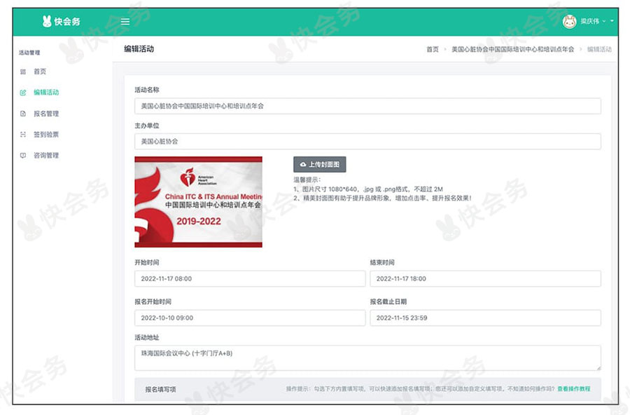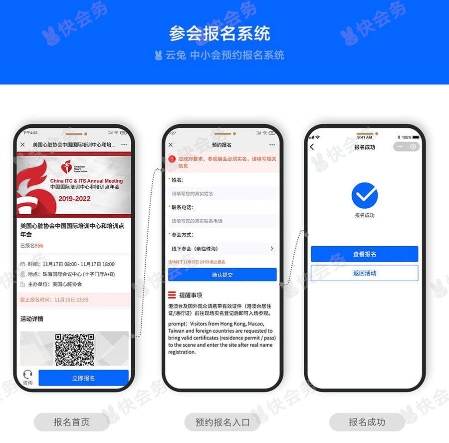 快会务是一个一站式数字化会议管理系统,它的高效率从活动发布、注册报名开始到活动结束后的数据管理每一个环节都能体现。本次大会有以下快会务大会系统支持: