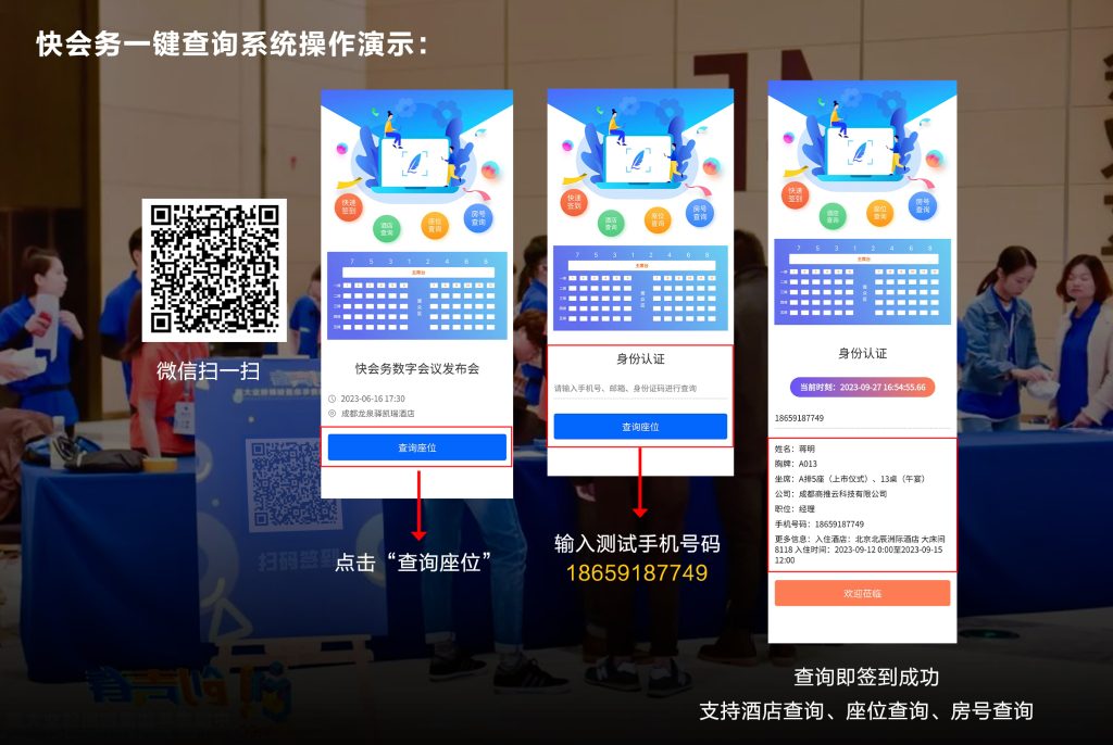 快会务一键查询系统:嘉宾只需输入姓名或单位名称即可查询个人的座位信息、桌位信息。主办方只需把桌位信息、座位信息、酒店住宿信息、接送机信息、分组信息等等整理成Excel表格,一键导入快会务系统即可。嘉宾通过主办设置的自定义查询字段即可查询出个人信息,真是方便又快捷。快会务一键查询系统支持精准签到模式和模糊查询模式,满足不同会议需求。